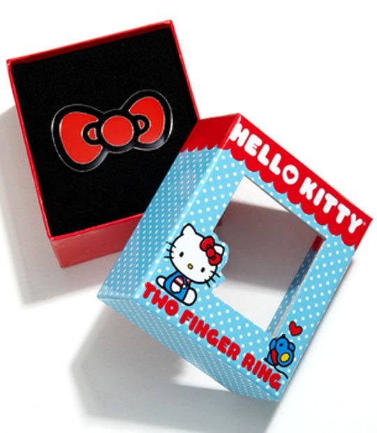 Sí, digo dedos, en plural y es que este anillo con la forma de su lazo rojo es doble y se coloca en dos de tus dedos. ¿Eso no tiene que ser un poco incómodo? Bueno, estoy seguro que por tu gatita favorita estarás dispuesta a eso y mucho más.